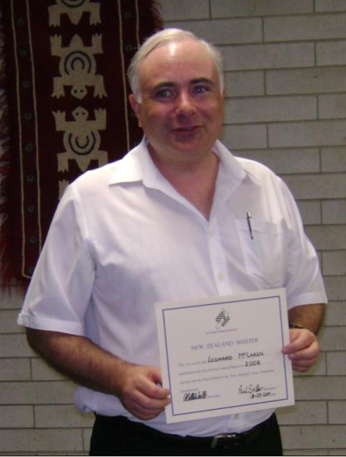 From 1989-1991 Leonard based himself in London and played in about 100 tournaments in Greater London and England during this time, including 3 British Championships scoring 5/11, 5/11 and 6/11 respectively. He returned to New Zealand in September 1991 with a wealth of experience, and then took a year off from chess. In late 1992 he got back into chess, and over the next several years slowly and painstakingly started to accumulate those National Master points. He was 3= in the New Zealand Championship in 2001. He was North Island Champion (jointly with Paul Garbett) 2004, 2006 and (jointly with Don Eade) 2007.