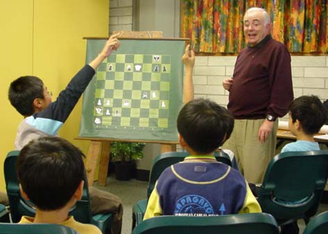 We are fortunate enough to have Leonard McLaren coaching our Junior classes every Tuesday night. We rotate our Juniors so that Leonard takes about 12 children in each class, so that all 60-70 children get some coaching about once every two months. Leonard has also given his time to playing a Simultaneous Display against the rest of the Club. On occasion a very strong player will run a group training session, open to Juniors and Seniors. Photo by Craig Blaxall.